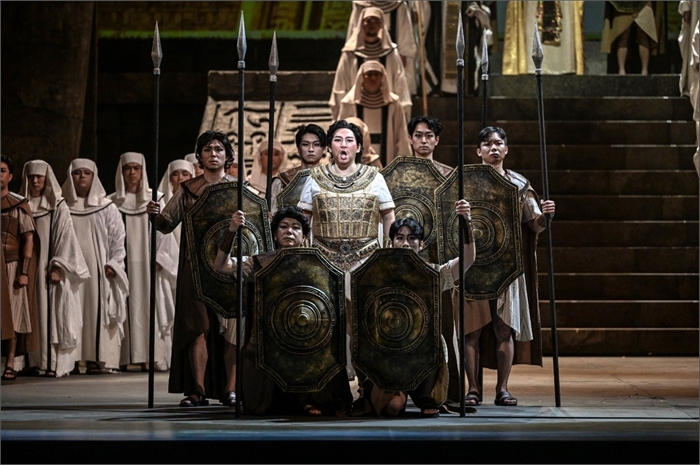 유명한 '개선 행진' 장면 역시 강대국 우월주의의 상징으로 폄하돼 그 황금빛 광채를 잃었고, 잿빛 콘크리트 배경에 현대식 군복을 입은 군인들이 '아이다' 무대를 채웠다. 그런 세계적 트렌드 속에서 지난 13일 저녁 서울시오페라단 창단 40주년 기념 오페라로 세종문화회관 대극장 무대에 오른 '아이다'는 전통적인 연출을 선호하는 관객들에게 모처럼 신선한 기쁨을 안겼다.