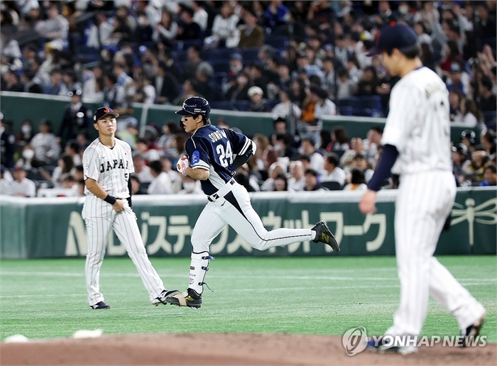 송성문의 달아나는 솔로홈런 (도쿄=연합뉴스) 이동해 기자 = 15일 일본 도쿄돔에서 열린 2025 K베이스볼 시리즈 대한민국과 일본의 평가전. 4회초 무사 주자없는 상황에서 송성문이 솔로홈런을 쏘아올린 뒤 그라운드를 돌고 있다. 2025.11.15 eastsea@yna.co.kr