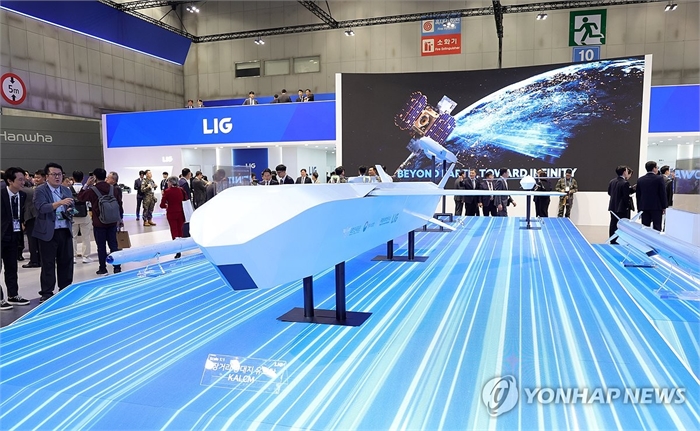 ADEX 공식 개막…장거리 공대지 유도탄 위용 (고양=연합뉴스) 김병만 기자 = 20일 경기도 고양시 킨텍스에서 열린 서울 국제 항공우주 및 방위산업 전시회(ADEX) 개막식에서 관람객들이 장거리 공대지 유도탄 등 첨단 무기들을 둘러보고 있다. 2025.10.20 kimb01@yna.co.kr
