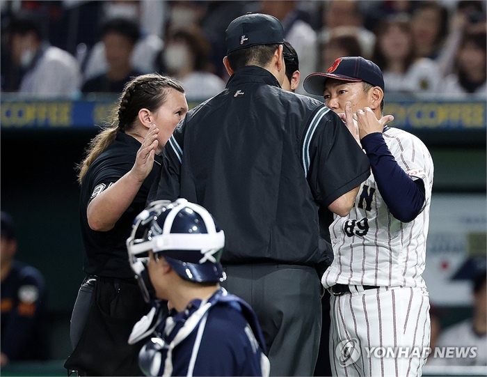 '계속되는 언쟁' (도쿄=연합뉴스) 이동해 기자 = 15일 일본 도쿄돔에서 열린 2025 K베이스볼 시리즈 대한민국과 일본의 평가전. 일본 야구대표팀 이바타 히로카즈 감독이 그라운드에 나와 심판진에게 어필하고 있다. 2025.11.15 eastsea@yna.co.kr