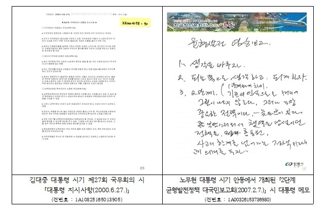 노무현 대통령 시기 공개된 자료에는 2007년 안동에서 열린 '2단계 균형발전정책 대국민보고회' 당시 작성한 친필 메모가 포함돼 있다. "좀 부담스러워서 채택을 망설이던 정책을 총동원해야 한다"는 내용이 적혀 있다.