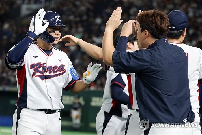 '해결사' 송성문 (도쿄=연합뉴스) 이동해 기자 = 16일 일본 도쿄돔에서 열린 2025 K베이스볼 시리즈 대한민국과 일본의 평가전. 3회말 2타점 적시타와 더블스틸로 득점의 발판을 만든 송성문이 이닝 종료 공수 교대로 더그아웃 향하고 있다. 2025.11.16 eastsea@yna.co.kr