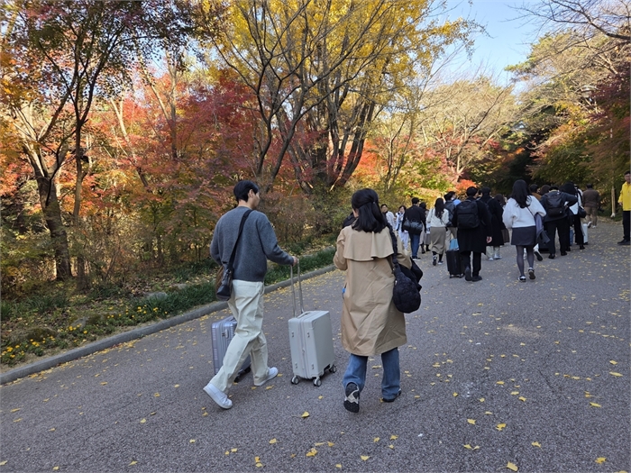 여성 참가자의 가방을 들어주며 수덕사로 향하는 남성 참가자 [촬영 정지수 수습기자]