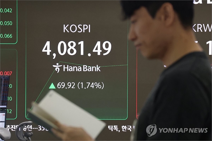 코스피 4,070대 상승 출발 (서울=연합뉴스) 서대연 기자 = 17일 오전 서울 중구 하나은행 본점 딜링룸 현황판에 코스피가 표시돼 있다.
