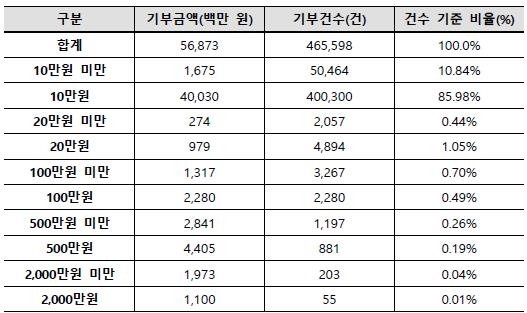 지난달 말 기준으로 전체 기부 건수 46만5천598건 가운데 기부액 10만원이 차지하는 비율이 40만300건으로 86%에 달한다. 또 10만원 미만은 5만464건, 10.8%로 전체 기부 건의 96.8%가 10만원 이하다.