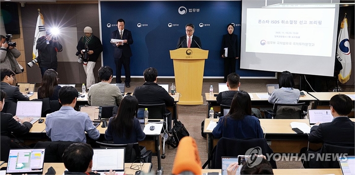 론스타 ISDS 취소결정 선고 브리핑 (과천=연합뉴스) 한종찬 기자 = 정홍식 법무부 국제법무국장이 19일 경기 과천시 정부과천청사 법무부에서 론스타 ISDS 취소 결정 선고 관련 브리핑을 하고 있다. 2025.11.19 saba@yna.co.kr