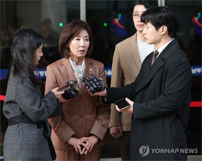 '벌금형 선고' 질문에 답하는 국민의힘 나경원 의원 (서울=연합뉴스) 김성민 기자 = 국민의힘 나경원 의원이 20일 서울 양천구 서울남부지방법원에서 열린 '국회 패스트트랙 충돌' 1심 선고 공판을 마친 후 나서며 취재진 질문을 받고 있다.
