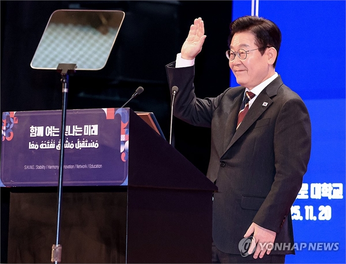 카이로대 학생들에게 인사하는 이재명 대통령 (카이로=연합뉴스) 한상균 기자 = 이집트를 공식 방문 중인 이재명 대통령이 20일(현지시간) 카이로대학에서 '함께 여는 빛나는 미래'를 주제로 연설을 마친 후 참석 학생들을 향해 인사하고 있다. 2025.11.21 xyz@yna.co.kr