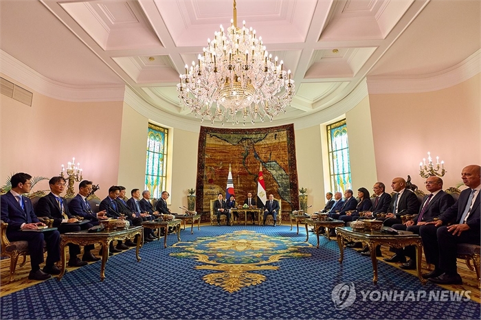 이어 "저도 이집트가 가자지구 휴전과 재건, 나아가 중동 평화를 위해 노력하고 있음을 높이 평가했으며 한국 정부도 가자 난민이 겪는 인도적 위기를 해결하기 위해 이집트와 계속 협력하겠다는 의사를 전했다"며 "양국은 서로의 역할을 지지하며 동시에 국제평화를 위해 연대하기로 했다"고 설명했다.