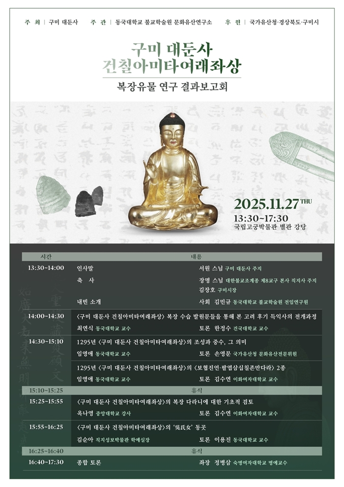 구미 대둔사와 동국대 문화유산연구소는 "보물 '구미 대둔사 건칠아미타여래좌상'의 복장 유물을 조사한 결과, 1295년에 제작됐음을 알려주는 (불상) 조성 발원문을 찾아냈다"고 21일 밝혔다.