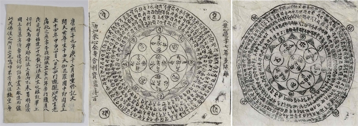 발견된 복장 유물 왼쪽은 '중수기문', 가운데와 오른쪽은 '보협진언·팔엽삼십칠존만다라' 2종 [국가유산청 제공. 재판매 및 DB 금지]