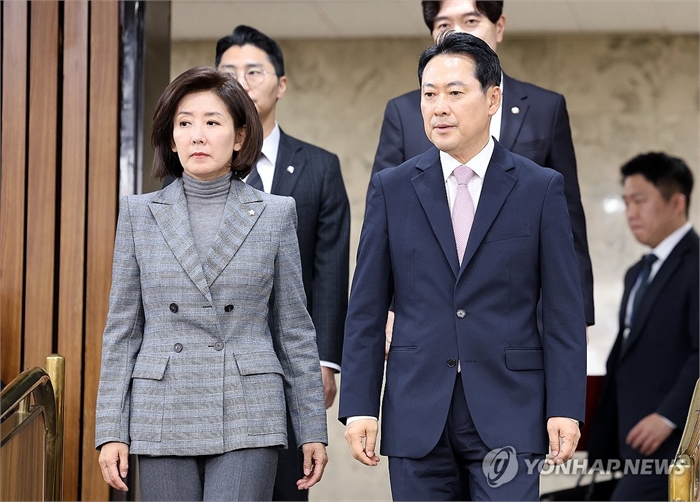 토론회 참석하는 장동혁 대표와 나경원 의원 (서울=연합뉴스) 이동해 기자 = 국민의힘 장동혁 대표와 나경원 의원이 24일 국회에서 열린 대장동 범죄수익환수 특별법 제정을 위한 긴급 토론회에 참석하고 있다. 2025.11.24 eastsea@yna.co.kr
