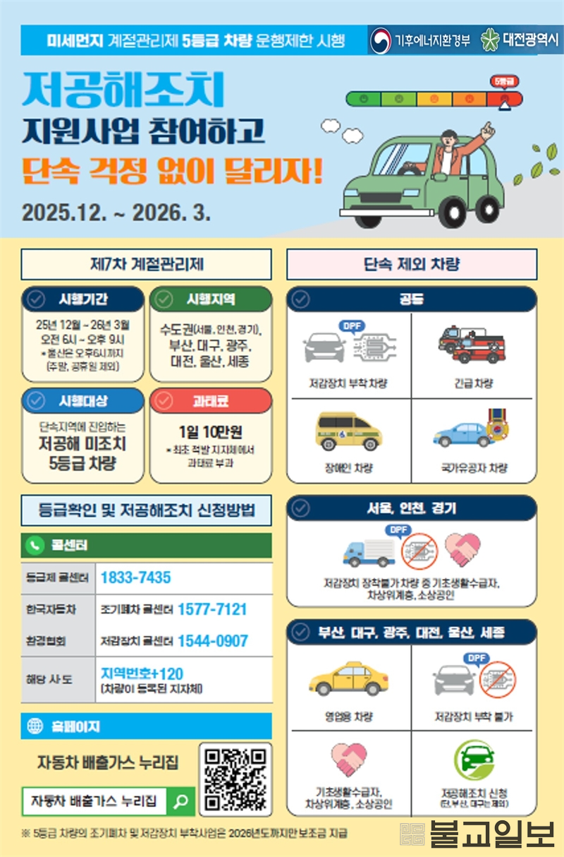 문창용 대전시 환경국장은 “겨울철 미세먼지로 인한 시민 건강 피해를 줄이기 위해 운행 제한은 불가피한 결정”이라며 “특히 5등급 차량의 조기폐차 및 저감장치 부착 지원사업은 2026년까지만 보조금이 지원되는 만큼, 차량 소유자는 가능한 빠른 시일 내에 지원사업을 신청해 주기 바란다”고 당부했다.