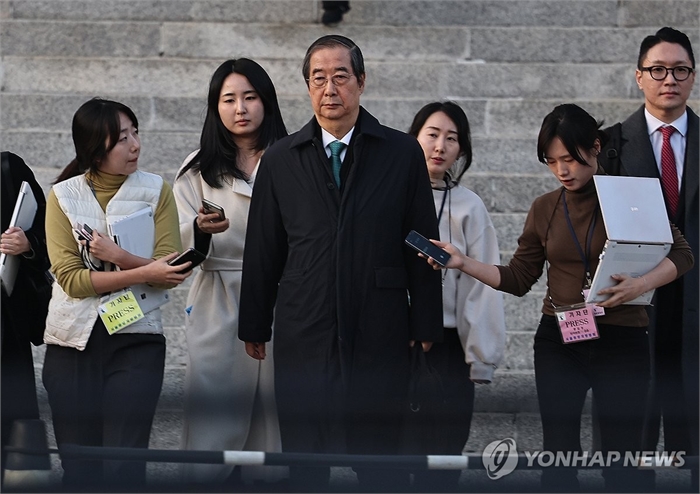 법원 나서는 한덕수 (서울=연합뉴스) 임화영 기자 = 내란 우두머리 방조 혐의를 받는 한덕수 전 국무총리가 26일 서울중앙지법에서 열린 1심 결심 공판을 마친 뒤 법원을 나서고 있다.