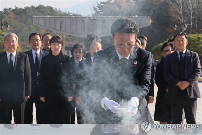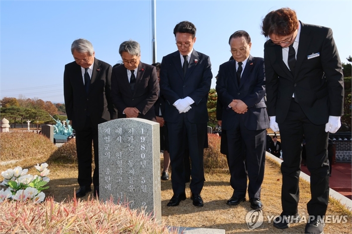 김민석 국무총리, 5·18 묘역 묵념 (광주=연합뉴스) 이정훈 기자 = 김민석 국무총리가 26일 광주 북구 국립5·18민주묘지를 찾아 묵념하고 있다. 2025.11.26 uwg806@yna.co.kr