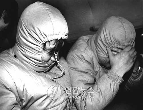 박종철 고문치사 경찰은 누굴까? 박종철군 고문치사 혐의를 받는 조한경 경위와 강진규 경사 호송 차량에 탄 경찰관들이 얼굴 노출을 피하려 똑같은 복장을 한 모습.1987.1.20 (서울=연합뉴스)