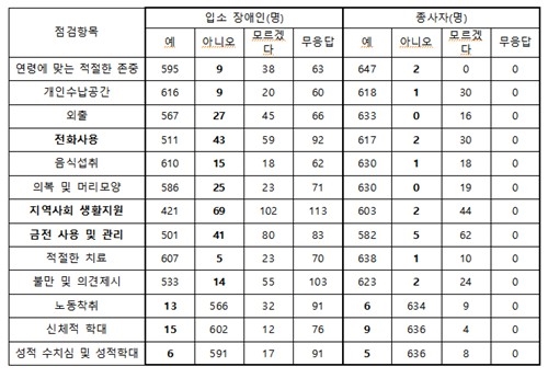 입소자와 종사자 일부는 신체적·성적 학대나 노동 착취를 겪었다고 답했으며 시설의 6%는 폐쇄회로(CC)TV를 설치하지 않은 것으로 파악됐다.