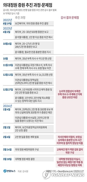 (기사발신지=연합뉴스) 이상현 고동욱 황윤기 기자 = 의료대란을 불러왔던 의대 입학 정원 2천명 일괄 증원 추진과 관련해 증원 규모 결정부터 대학별 정원 배정에 이르기까지 전반적으로 문제가 있었다는 감사 결과가 나왔다.