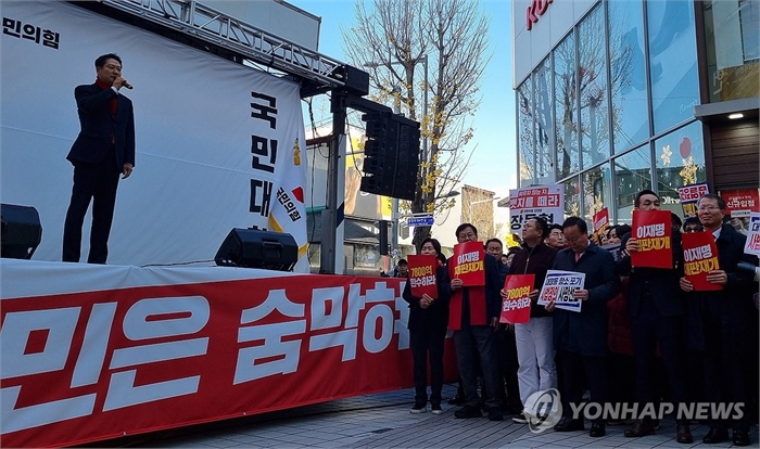 대전 찾은 국민의힘 장동혁 (대전=연합뉴스) 박주영 기자 = 국민의힘 장동혁 대표가 29일 오후 대전 중구 으능정이 거리에서 열린 '국민의힘 민생회복 법치수호 국민대회'에 참석해 발언하고 있다. 2025.11.29 jyoung@yna.co.kr