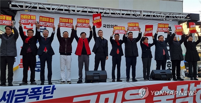 국민의힘 '민생회복과 법치수호 대전 국민대회' (대전=연합뉴스) 박주영 기자 = 국민의힘 장동혁 대표가 29일 대전 중구 으능정이 거리에서 열린 '국민의힘 민생회복 법치수호 대전 국민대회'에서 최고위원, 시당위원장 등과 함께 구호를 외치고 있다. 2025.11.29 jyoung@yna.co.kr