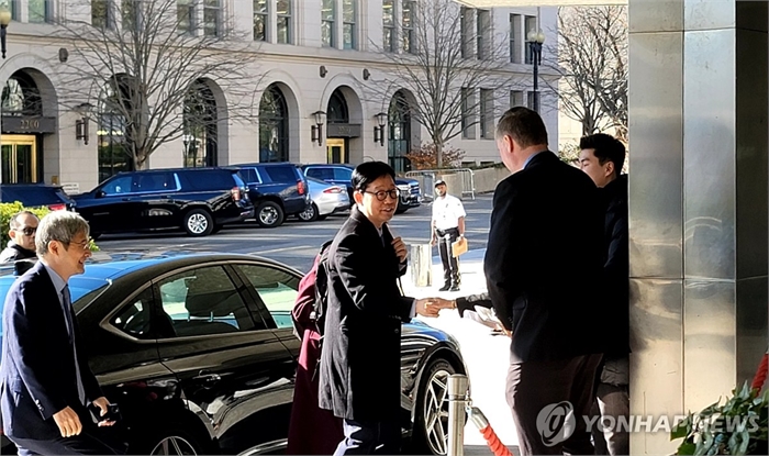 미 국무부 청사 입장하는 박윤주 외교1차관 (워싱턴=연합뉴스) 조준형 특파원 = 박윤주 외교부 1차관(왼쪽)이 1일(현지시간) 크리스토퍼 랜도 국무부 부장관과의 회담을 위해 워싱턴DC의 국무부 청사에 들어가고 있다. 2025.12.2 jhcho@yna.co.kr