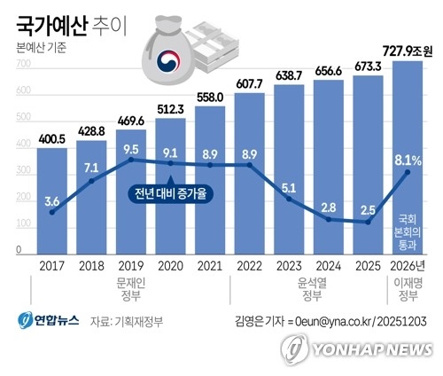 지난해 윤석열 정부가 편성한 올해 본예산(673조3천억원)보다 8.1% 늘어났다.
