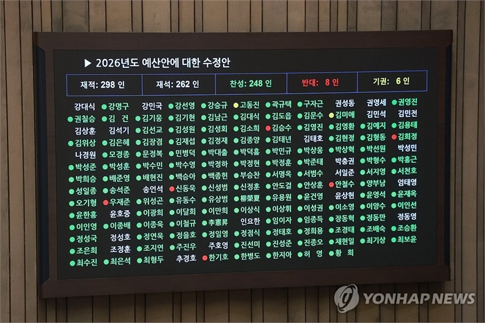 2026년도 예산안 가결 (서울=연합뉴스) 신현우 기자 = 예산안 처리 법정 시한인 2일 국회 본회의에서 2026년도 예산안에 대한 수정안이 찬성 248인, 반대 8인, 기권 6인으로 가결되고 있다. 2025.12.2 nowwego@yna.co.kr