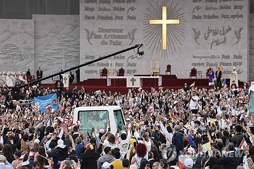 베이루트 해안 미사에 운집한 레바논 신자들과 교황 [AP 연합뉴스 재판매 및 DB 금지]