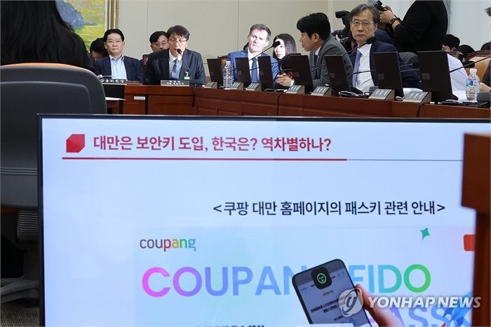 책임 추궁받는 박대준 쿠팡 대표이사 (서울=연합뉴스) 김주성 기자 = 3일 국회 정무위원회에서 열린 쿠팡 개인정보 유출 사태 관련 현안질의에서 박대준 쿠팡 대표이사가 위원 질의에 답하고 있다. 오른쪽은 브랫 매티스 쿠팡 최고 정보 보호 책임자(CISO). 2025.12.3 utzza@yna.co.kr