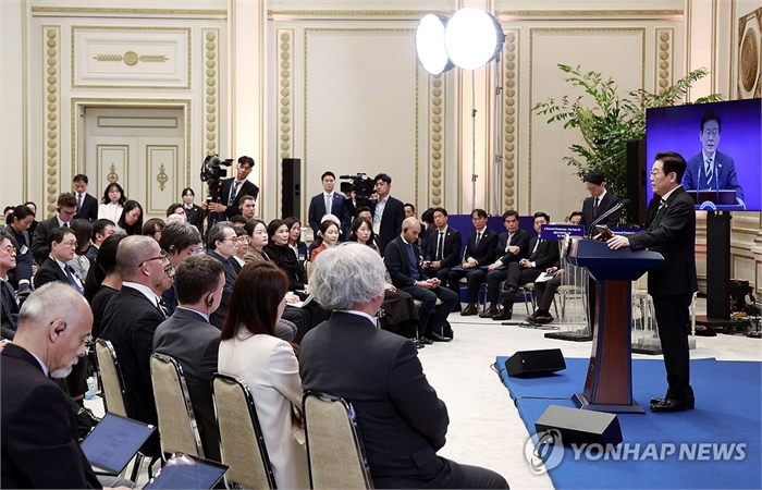 영빈관에서 열린 외신 기자회견 (서울=연합뉴스) 김도훈 기자 = 이재명 대통령이 3일 청와대 영빈관에서 외신 기자들과 '새롭게 선 민주주의, 그 1년' 기자회견을 하고 있다. 2025.12.3 [대통령실통신사진기자단] superdoo82@yna.co.kr