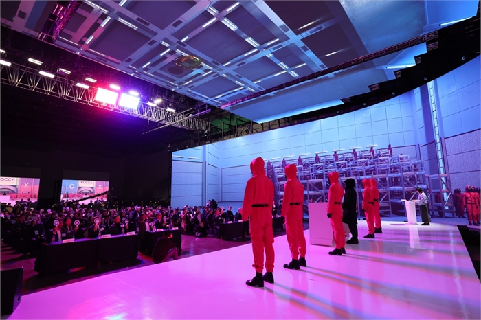 넷플릭스 드라마 '오징어게임' 속 캐릭터인 '프론트맨'으로 분장해 무대에 오른 유현석 한국콘텐츠진흥원장 직무대행의 축사도 인상적이었다. 가상으로 구현된 '오징어게임'의 참가자 대기실 한가운데 선 유 직무대행은 "버추얼 스튜디오 개관은 K-콘텐츠의 질적 도약을 선언하는 역사적인 순간"이라며 "국내 제작사들이 더 넓은 상상력으로, 더 빠르게, 더 효율적으로, 더 창의적인 콘텐츠 영상을 제작할 수 있게 하는 획기적인 전환점이 될 것"이라고 강조했다.