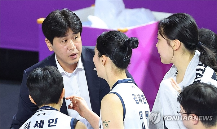 작전 지시하는 김종민 감독 (인천=연합뉴스) 임순석 기자 = 3일 인천 삼산월드체육관에서 열린 프로배구 V리그 여자부 흥국생명과 한국도로공사의 경기. 한국도로공사 김종민 감독이 작전 지시하고 있다. 2025.12.3 soonseok02@yna.co.kr