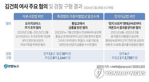 (기사발신지=연합뉴스) 김빛나 이승연 이도흔 기자 = 민중기 특별검사팀이 3일 도이치모터스 주가조작 혐의 등으로 구속기소 된 김건희 여사에게 징역 15년을 구형했다. 1심 선고기일은 오는 1월 28일로 잡혔다.