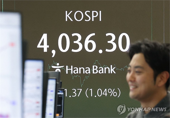 코스피 4천선 회복 (서울=연합뉴스) 김성민 기자 = 3일 오후 서울 중구 하나은행 본점 딜링룸 현황판에 코스피 지수가 표시돼 있다.