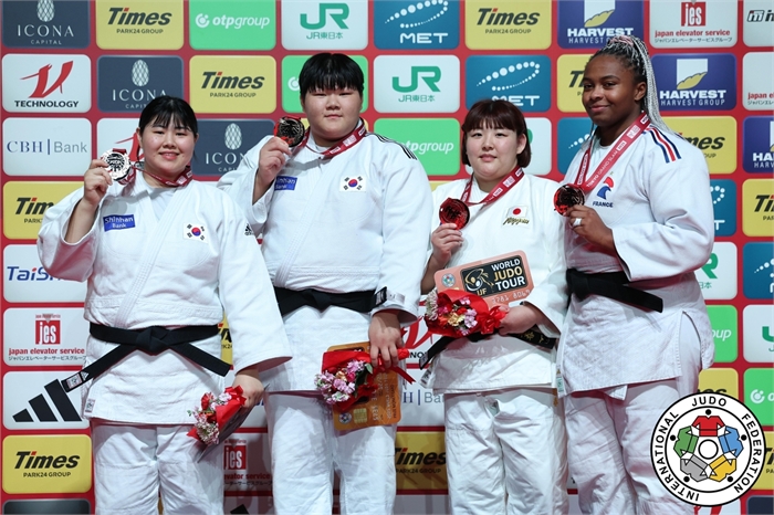 금메달 딴 이현지와 은메달리스트 김하윤 이현지(왼쪽에서 두 번째)가 7일 일본 도쿄 체육관에서 열린 2025 국제유도연맹(IJF) 도쿄 그랜드슬램 여자 78㎏ 이상급에서 우승한 뒤 금메달을 목에 걸고 포즈를 취하고 있다. 맨 왼쪽은 결승에서 이현지에게 패해 은메달을 획득한 대표팀 선배 김하윤. [IJF 홈페이지 캡처. 재배포 및 DB 금지]