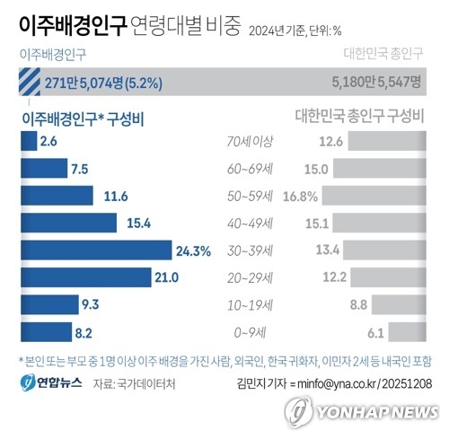 [그래픽] 이주배경인구 연령대별 비중 (서울=연합뉴스) 김민지 기자 = 8일 국가데이터처가 발표한 '2024년 이주배경인구 통계 결과'에 따르면 지난해 우리나라 이주배경인구는 총인구와 연령대별 인구 구성비를 비교했을 때 30대 이하 청년층이 많고 고령인구 비중은 적은 것이 특징인 것으로 나타났다.