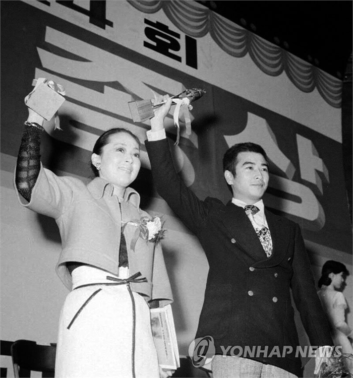 제14회 대종상 남녀주연상 수상한 김지미-하명중 (서울=연합뉴스) 국가기록원이 20일 공개한 1975년 제14회 대종상 남녀주연상 수상자 김지미와 하명중.
