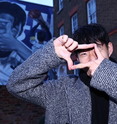 자기 모습이 담긴 벽화 앞에서 찰칵 세리머니를 펼치는 손흥민 [토트넘 홋스퍼 SNS 캡처. 재판매 및 DB 금지]