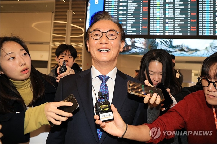 질문 받는 전재수 해양수산부 장관 (영종도=연합뉴스) 김주형 기자 = 전재수 해양수산부 장관이 11일 '유엔해양총회' 유치 활동을 마치고 귀국해 취재진 질문을 받으며 이동하고 있다. 전재수 장관은 이날 사의를 표명했다. 2025.12.11 [공동취재] kjhpress@yna.co.kr