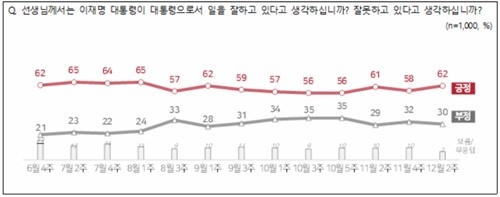 (기사발신지=연합뉴스) 김유아 기자 = 이재명 대통령의 국정운영을 긍정적으로 평가한 비율이 62%로 상승했다는 여론조사 결과가 11일 나왔다.