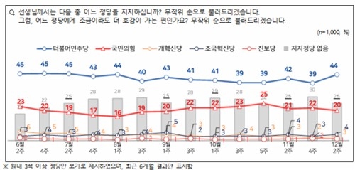 정당별 지지도를 보면 더불어민주당은 44%, 국민의힘은 20%를 각각 기록했다.