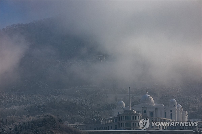 안개 낀 통일교 천정궁 (가평=연합뉴스) 임병식 기자 = 경찰이 정치권 통일교 금품 수수 의혹과 관련해 압수수색에 나선 15일 오전 경기도 가평군 통일교 천정궁 일대 위로 겨울 안개가 지나가고 있다. 2025.12.15 andphotodo@yna.co.kr