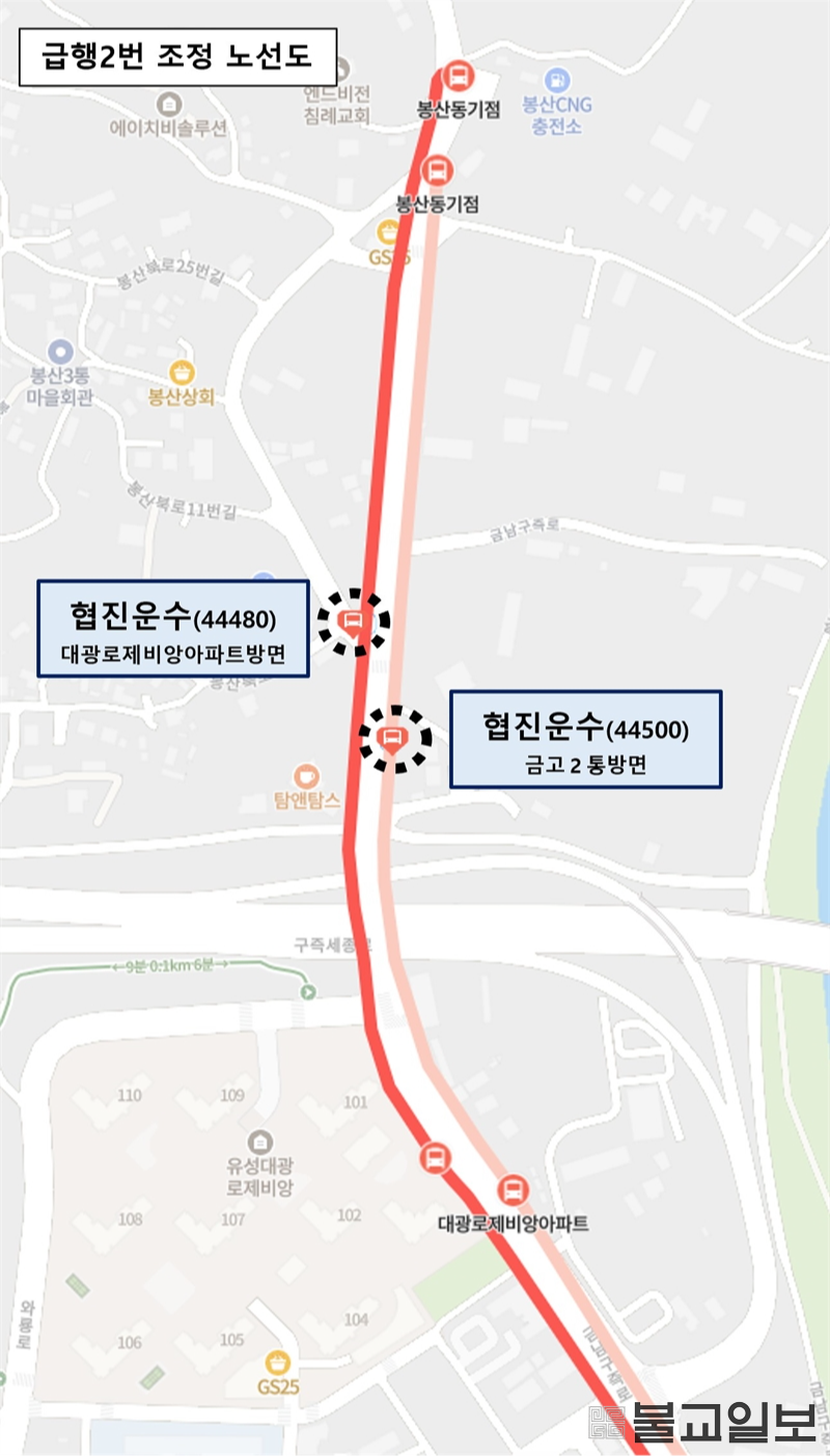 이와 함께 봉산동기점지 인근에서 반복적으로 발생하던 무단횡단 문제를 해소하고 보행자 안전을 강화하기 위해 협진운수 정류장을 급행2번 노선에 추가 정차하도록 조정했다. 이를 통해 시민들이 보다 안전한 환경에서 시내버스를 이용할 수 있을 것으로 기대된다.