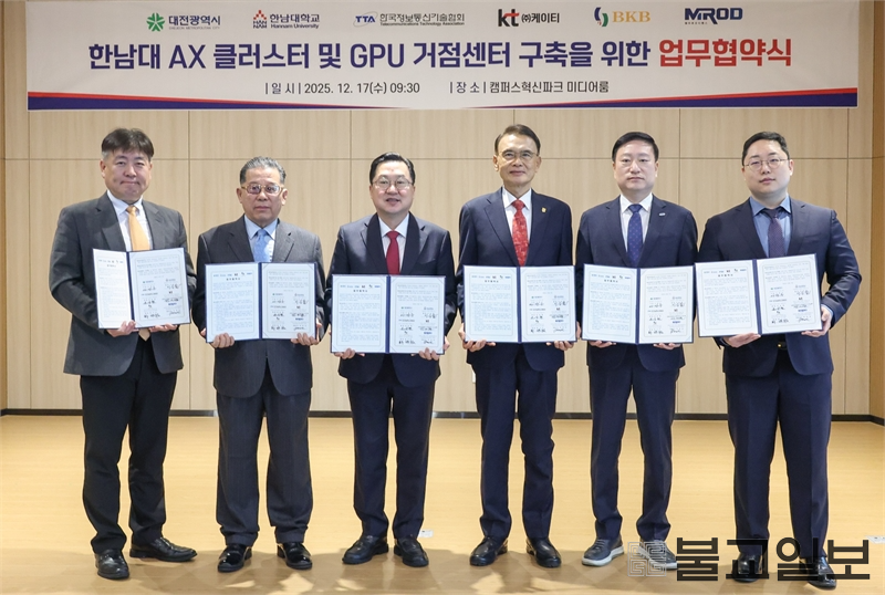 대전시는 17일 한남대학교, 한국정보통신기술협회(TTA), ㈜KT, 비케이비에너지㈜, ㈜엠아르오디펜스와 ‘한남대 AX 클러스터 및 고성능 AI GPU 거점센터’ 구축을 위한 업무협약을 체결했다. 이번 협약은 전 세계적으로 인공지능 기술 경쟁이 심화되는 가운데, 지역 내 연구기관과 AI 전문기업의 고성능 연산 자원 수요에 대응하기 위해 추진됐다.