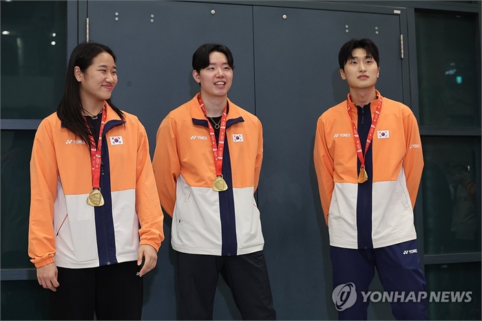 배드민턴 대표팀 화려한 귀국 (영종도=연합뉴스) 임화영 기자 = 배드민턴 월드투어 파이널스에서 여자단식을 제패하고 11관왕을 달성한 안세영과 배드민턴 복식 조를 결성한 지 11개월 만에 11번의 우승을 달성한 서승재와 김원호가 22일 인천국제공항을 통해 귀국해 포즈를 취하고 있다. 2025.12.22 hwayoung7@yna.co.kr