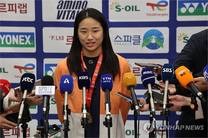 인터뷰하는 안세영 (영종도=연합뉴스) 임화영 기자 = 배드민턴 월드투어 파이널스에서 여자단식을 제패하고 11관왕을 달성한 안세영이 22일 인천국제공항을 통해 귀국, 인터뷰를 하고 있다. 2025.12.22 hwayoung7@yna.co.kr