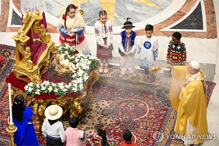 교황 레오 14세, 즉위 후 첫 성탄절 전야 미사 집전 [AFP=연합뉴스. 재판매 및 DB 금지 (Photo by Matteo Pernaselci / VATICAN MEDIA / AFP) / RESTRICTED TO EDITORIAL USE - MANDATORY CREDIT "AFP PHOTO / VATICAN MEDIA" - NO MARKETING NO ADVERTISING CAMPAIGNS - DISTRIBUTED AS A SERVICE TO CLIENTS]