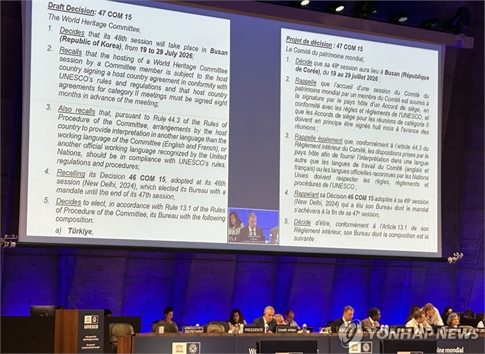 내년 세계유산위원회, 부산서 열린다 (파리=연합뉴스) 김예나 기자 = 15일(현지시간) 프랑스 파리 유네스코 본부에서 제47차 세계유산위원회가 열리고 있다. 이날 세계유산위는 차기 개최국으로 대한민국을 확정했다. 제48차 위원회는 내년 7월 19∼29일 부산에서 열릴 예정이다. 2025.7.16 yes@yna.co.kr