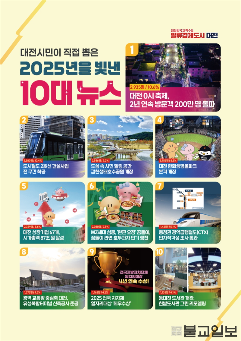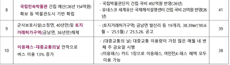 이외에도 국립민속박물관 예산 확보, 토지거래허가구역 해제, 이응패스 안착 등이 10대 뉴스에 포함됐다. 특히 이응패스 시행으로 버스 이용객이 13% 증가하는 성과를 거뒀다.