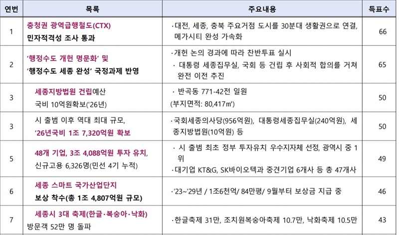 자족 기능 확충 노력도 상위권에 올랐다. 5위는 ‘3조 원대 투자 유치 및 신규 고용 창출’이 차지했다. 이어 스마트 국가산단 보상 착수와 세종시 3대 축제(한글·복숭아·낙화)의 흥행이 각각 6위와 7위에 올랐다.